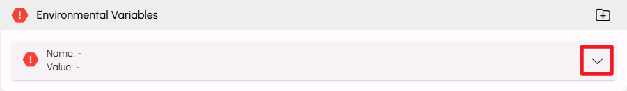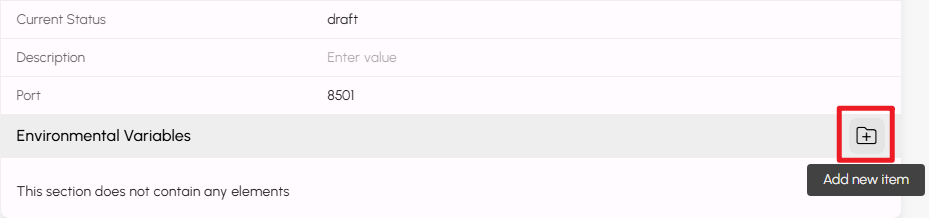 - If your application uses environment variables, hover over the Environmental Variables bar to display the add icon, then click it to create a new variable.