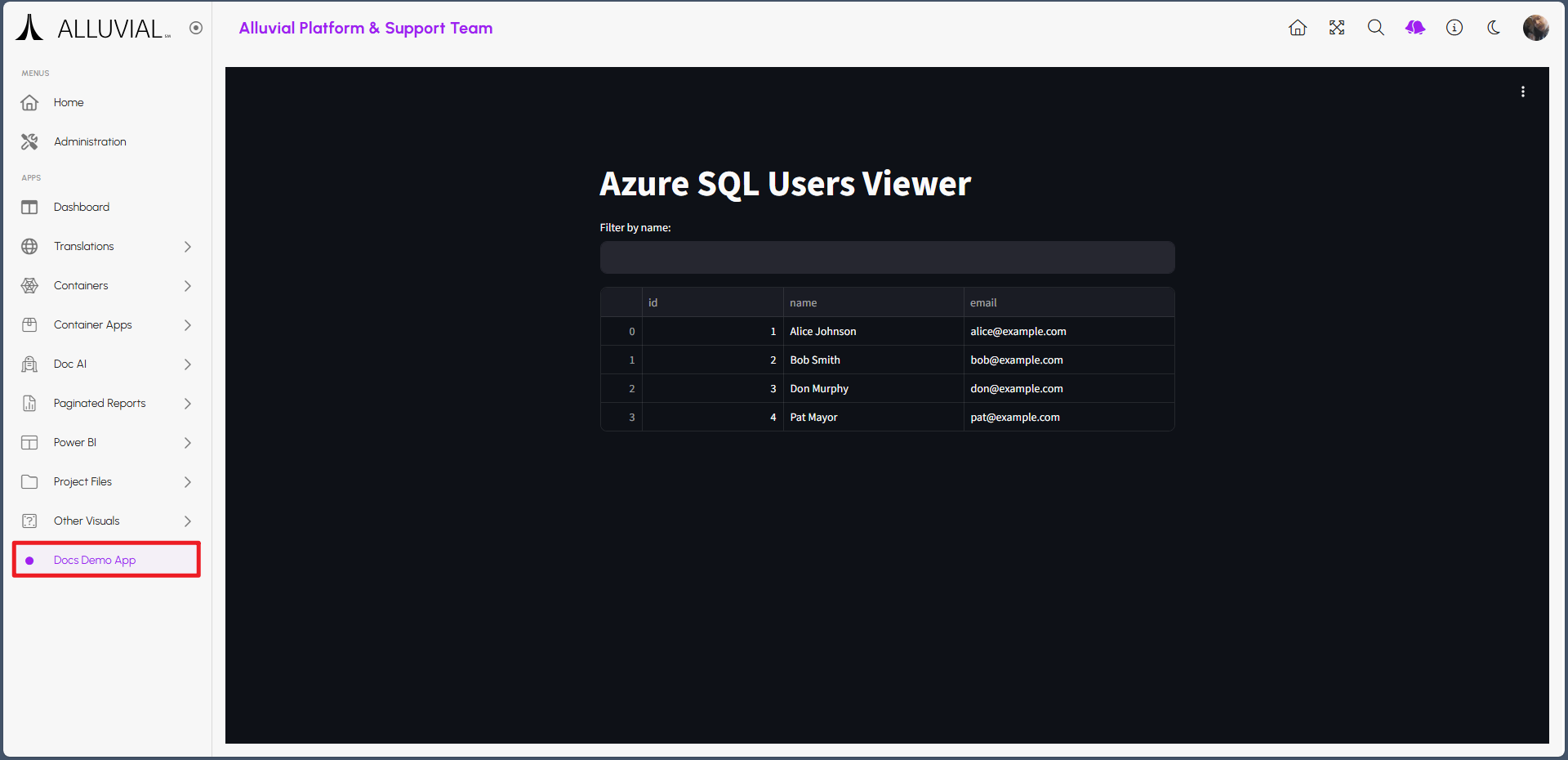 Alluvial supports embedding containerized applications built with frameworks such as RShiny, Streamlit, Angular, and others.