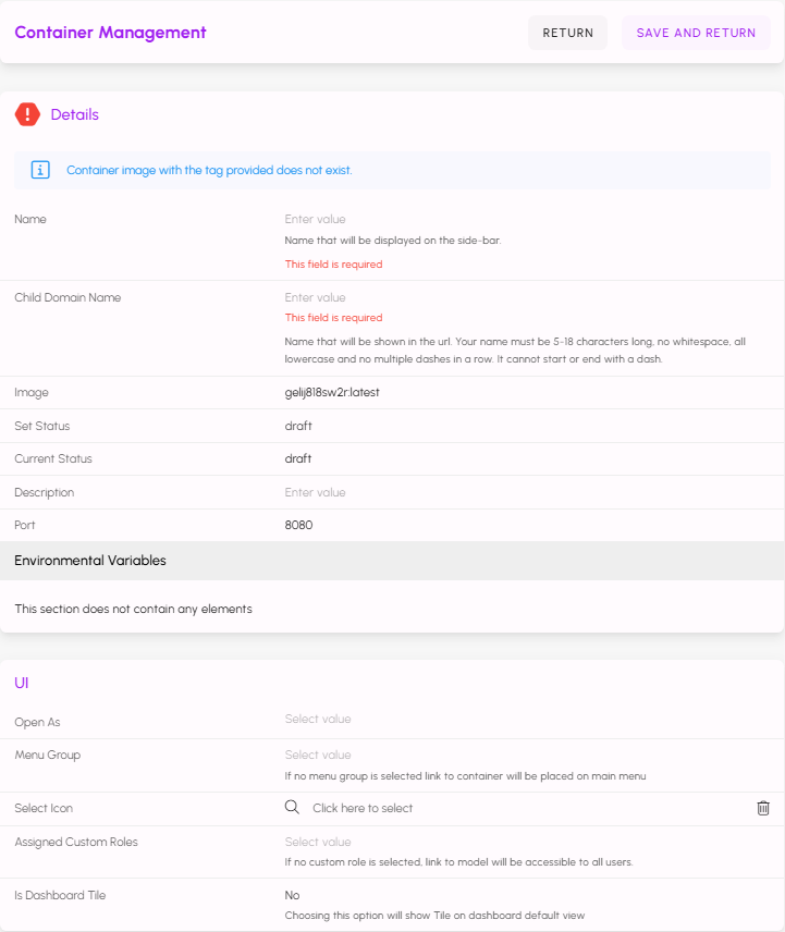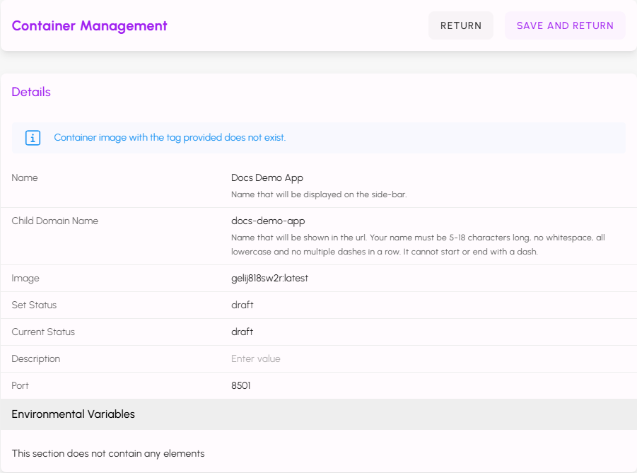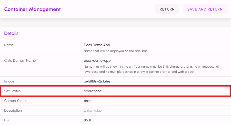 If you need to change the Port or add, remove, or modify any of the Environment Variables for your application, first set the status to draft and click SAVE AND RETURN. Navigate back to the application's configuration, make the changes, and then set the status back to operational and click SAVE AND RETURN again.