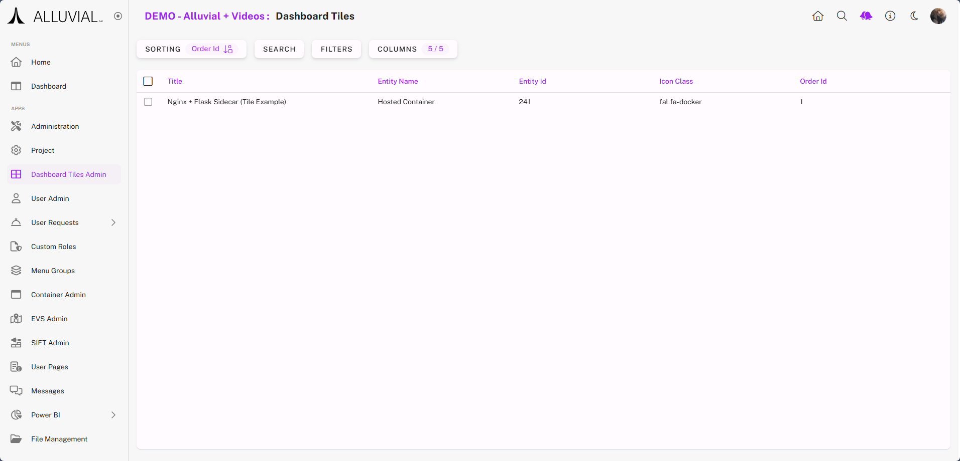 - Return to the Dashboard Tiles admin page. Your configured item should now be listed.