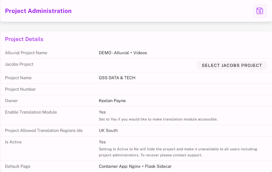 The Project Administration module allows project administrators to update key details and configurations for an Alluvial project.