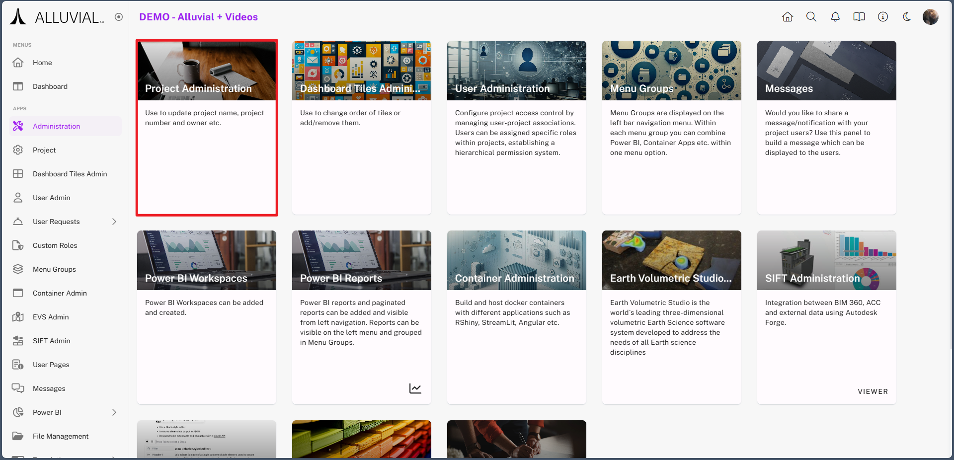 IMPORTANT: Administration modules only appear for users who have been assigned the relevant Permissions to Manage in User Administration. If a module is missing, a project owner or project administrator should update that user's permissions. This can include assigning permissions to yourself.